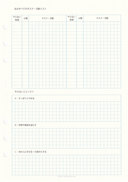 | 2.『私のすべてのタスク・活動リスト』 | 「やらないこと」を決める準備段階として、現在あなたが行っている仕事やプライベートの活動を、カテゴリを問わず全て書き出すためのシートです。頭の中にあるタスクを一覧にすることで、思考が整理され、自分の活動全体を客観的に見渡すための土台を築きます。 |
