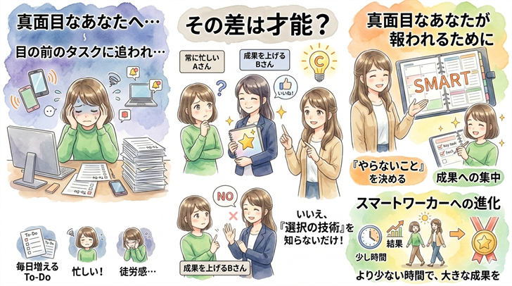 一方、BさんはAさんほど忙しそうには見えません。時には依頼を丁寧に断ったり、参加しない会議があったりします。それなのに、月末になると、なぜかいつもBさんの方が大きなプロジェクトを成功させ、高い評価を得ている…。