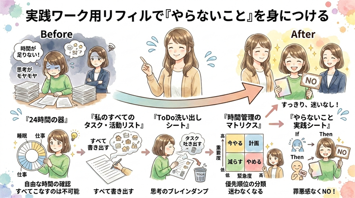 | 5.『やらないこと実践シート』 | 「断る」「やめる」と決めたことを、具体的な行動計画に落とし込むためのシートです。「もし(if)〇〇が起きたら、その時は(then)△△する」という形で事前計画を立てることで、いざという場面でも、罪悪感やプレッシャーを感じることなく、冷静に対応できるようになります。 |