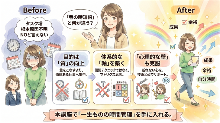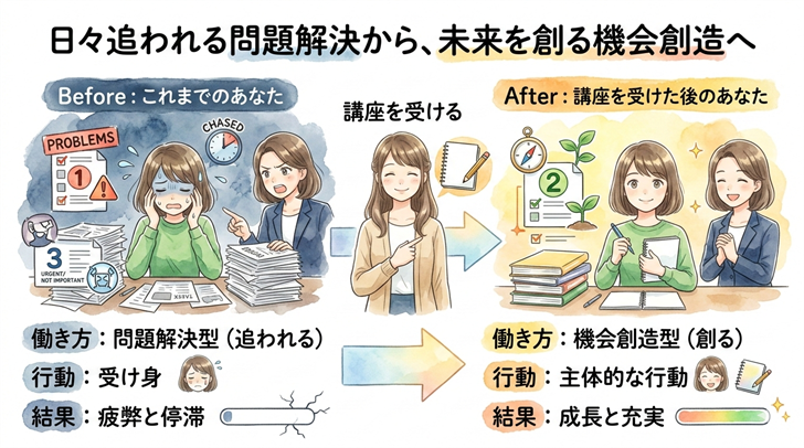これまで「いつかやろう」と後回しにしてきた、自己投資のための学習、数年後を見据えたキャリア設計、そして、あなたを支えてくれる人々との関係構築。本講座は、こうした「重要だが緊急でない」活動のための時間を、あなたのスケジュールの中に意図的に生み出します。日々の目の前のタスク処理に追われるのではなく、自らの未来を豊かにするために、着実に時間を使えるようになります。