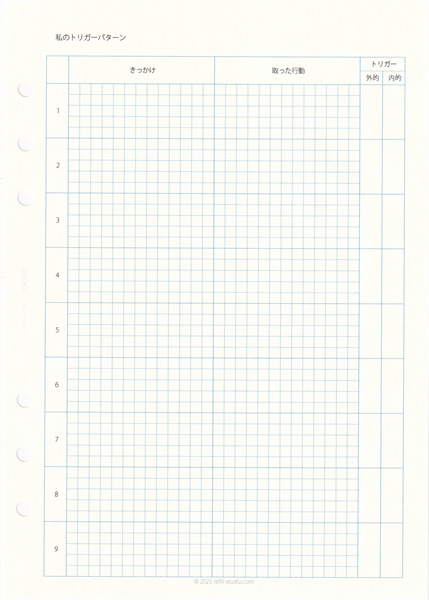 | 2.『私のトリガーパターン』 | あなたの集中を妨げる、自分特有の「きっかけ(トリガー)」を客観的に把握するための自己分析ツールです。集中が途切れた瞬間に、その原因がスマホの通知といった「外的トリガー」なのか、不安や退屈といった「内的トリガー」なのかを記録・分析し、具体的な対策を立てるための土台を築きます。 |