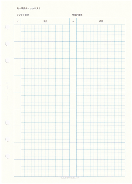 | 3.『集中準備チェックリスト』 | 最高のパフォーマンスを発揮するプロのように、集中作業に入る前の「儀式」をあなた専用にリスト化します。デジタル環境(通知オフ等)と物理的環境(机の整理等)の両面から準備項目を定めることで、いつでも最高の集中状態を意図的に「再現」できるようになります。 |