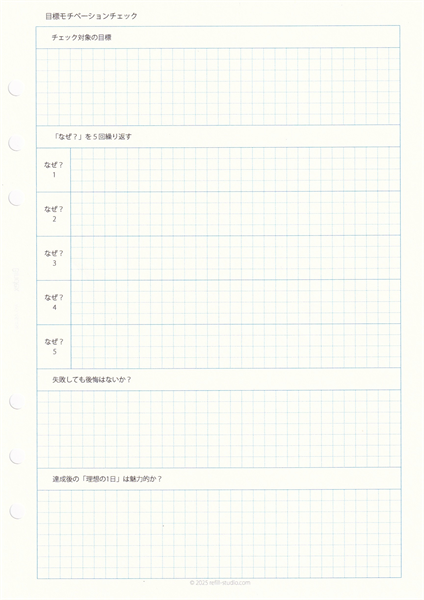 1.『目標モチベーションチェック』 「なぜ?」を5回繰り返すなどの質問を通して、あなたの目標が本当に「自分軸」であるかを最終確認します。計画の土台となる動機を固め、目標達成への揺るぎない原動力とします。