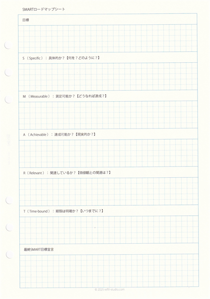 2.『SMARTロードマップシート』 SMARTの法則の5つの基準(具体的、測定可能、達成可能、関連性、期限)に沿って、あなたの目標を具体的で実行可能な「目標宣言」へと磨き上げます。あなたの行動の最高の指針となります。