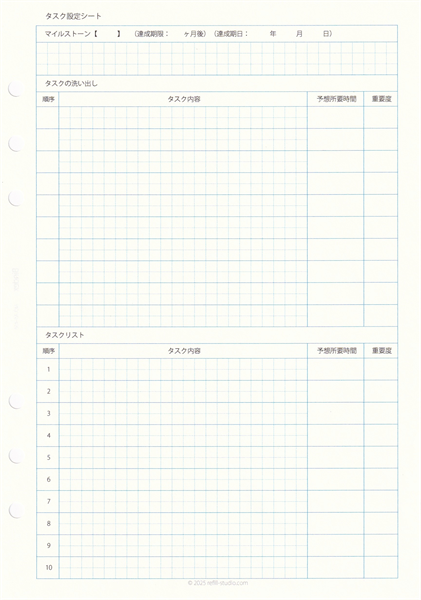 3.『マイルストーン設定シート』 最終ゴールから逆算(バックキャスティング)し、達成までの中間目標(マイルストーン)を明確に設定します。これにより、長期的な計画の進捗管理が可能になり、モチベーションが維持しやすくなります。
