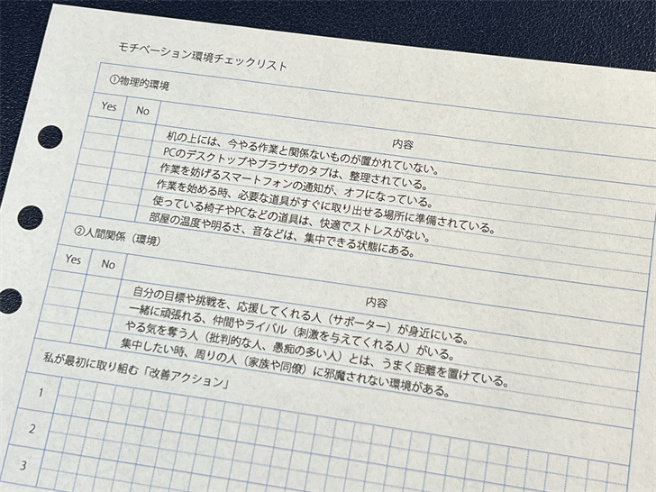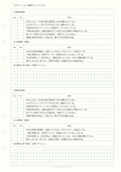 1.『モチベーション環境チェックリスト』 あなたのやる気を奪っている「ノイズ(物理・人間関係)」を客観的に診断します。最初に取り組むべき「環境改善アクション」を明確にし、エネルギー漏れを塞ぎます。