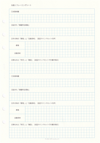2.『失敗リフレーミングシート』 過去の苦い「失敗体験」を、未来のあなたを支える「価値ある教訓」へと書き換えます。ネガティブな記憶をポジティブな資産に変える、心のトレーニングシートです。
