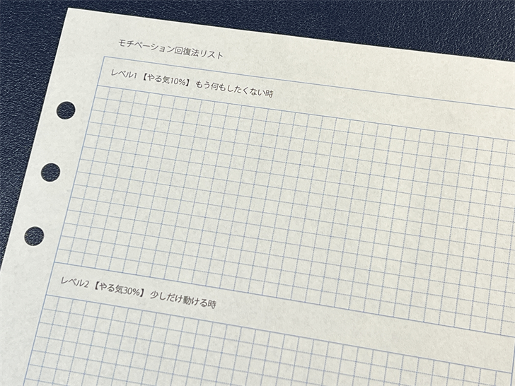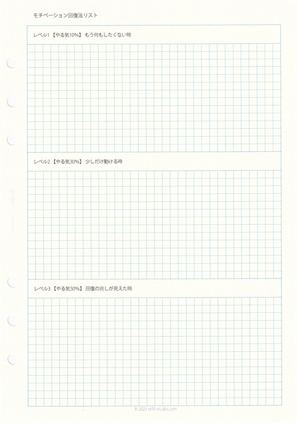 3.『モチベーション回復法リスト』 やる気がゼロになった時に、何も考えずに実行できるあなただけの「心の応急手当セット」を作成します。「休む」「動く」「思い出す」の3方向から回復をサポートします。
