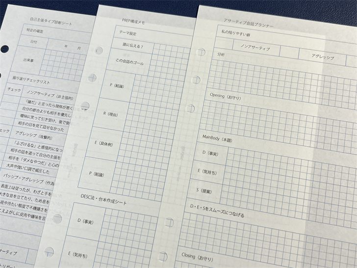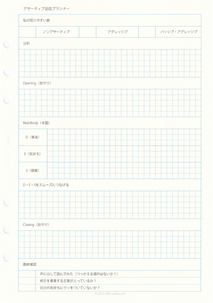 | 4.『アサーティブ会話プランナー』 | お守りフレーズ(クッション言葉)から本題のシナリオまで、最初から最後までの一連の流れを統合し、本番での頭の真っ白を防ぐためのリハーサルシートです。 |