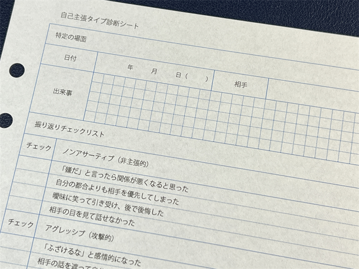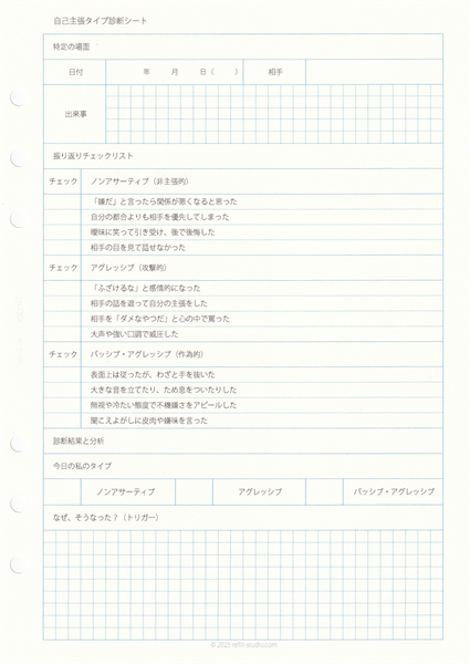 | 1.『自己主張タイプ診断シート』 | 過去の後悔している会話を分析し、あなたが「我慢」や「攻撃」に走ってしまう無意識のトリガー(引き金)を特定し、行動を客観視します。 |