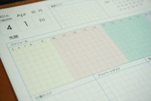 | 見開き1週間で時間軸が縦のタイプです。 | 見開き1週間でスケジュール欄が左ページにあるタイプです。時間軸が横のタイプです。 | 見開き1ヶ月のタイプです。 | |||