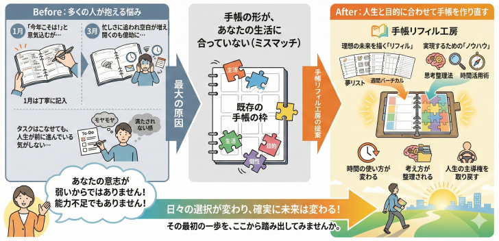 提供するのは、理想の未来を描くための「リフィル」と、それを実現するための「ノウハウ」。手帳を使って、時間の使い方を変え、考え方を整理し、人生の主導権をあなたの手に取り戻しましょう。