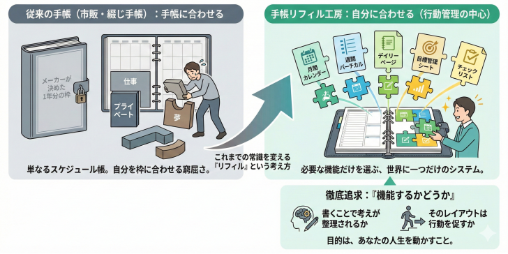 多種多様なパーツ(リフィル)の中から、今のあなたに必要な機能だけを選び出し、システム手帳というバインダーの上でパズルのように組み合わせる。