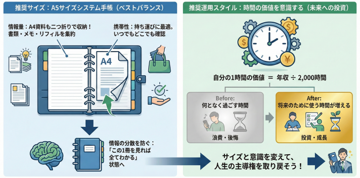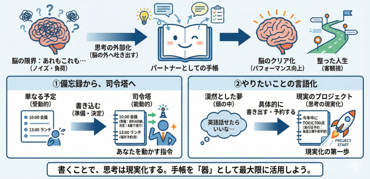 それは、紙の手帳を単なる「スケジュール帳」で終わらせず、あなたの人生を理想の方向へと進めるための「行動管理の中心」へと変えることです。