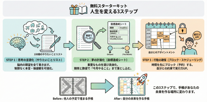 そんな方のために、手帳リフィル工房では「無料スターターキット」を用意しています。これは、リフィルだけでなく、このサイトが提唱する「人生を変える3ステップ」を体験できるパッケージです。