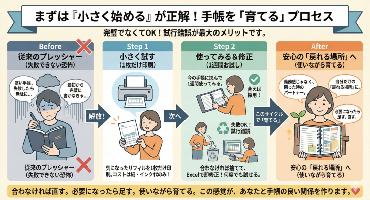 ここまで読んで、「なんだか大変そうだな」と感じた方もいるかもしれません。でも、安心してください。最初から完璧な手帳を作る必要はありません。