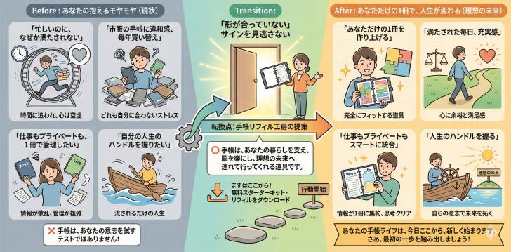 もし今、手帳に違和感があるなら、それはあなたが悪いのではなく、「形が合っていない」というサインです。そのサインを見逃さず、手帳リフィル工房のコンテンツをヒントにして、あなただけの1冊を作り上げてください。
